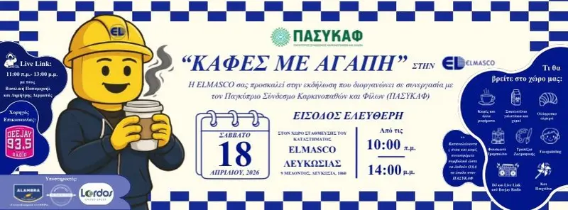 Η ELMASCO σας προσκαλεί με ιδιαίτερη χαρά στην εκδήλωση που διοργανώνει για τον Παγκύπριο Σύνδεσμο Καρκινοπαθών και Φίλων (ΠΑΣΥΚΦ) «Καφές με Αγάπη».