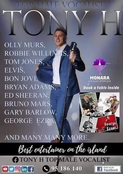 Ελάτε μαζί μας αυτό το ΣΑΒΒΑΤΟ από τις 16:00 στο Monara Live Music & Sports Bar για ένα φανταστικό απόγευμα ζωντανής ψυχαγωγίας με τον Tony H να ερμηνεύει όλα τα αγαπημένα σας από τους Olly Murs, Robbie Williams, Tom Jones, Elvis, Bon Jovi, Bryan Adams, Ed Sheeran, Bruno Mars, Gary Barlow, George Ezra και πολλούς άλλους.